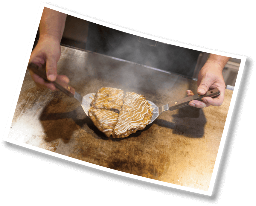 旬の食材を使用した「鉄板焼きメニュー」は当店の人気メニュー。海老、むつ、鯖などの魚介類から肉料理まで幅広く揃えています。お好み焼きだけではなく、さまざまな味を楽しめるのが当店の特徴です。
